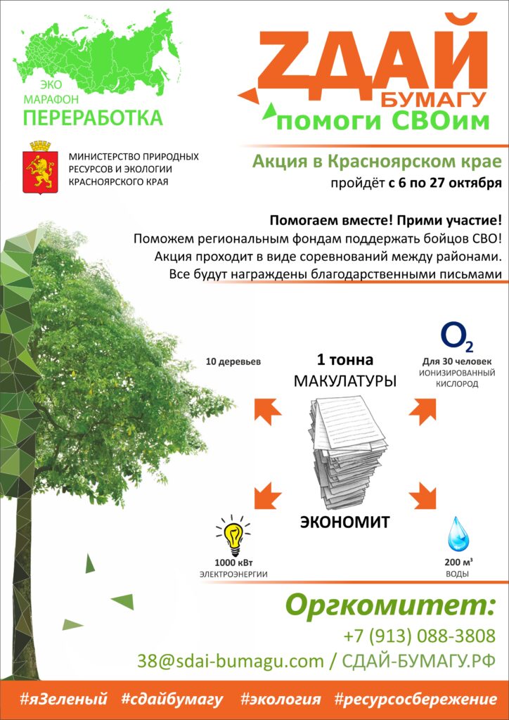 Всероссийский Эко-марафон ПЕРЕРАБОТКА осенью 2025 года в Красноярском крае планирует проведение акции под девизом: «Zдай бумагу – помоги СВОим», который проводится при поддержке краудфандинг проекта «Подари Дерево» www.подари-дерево.рф.