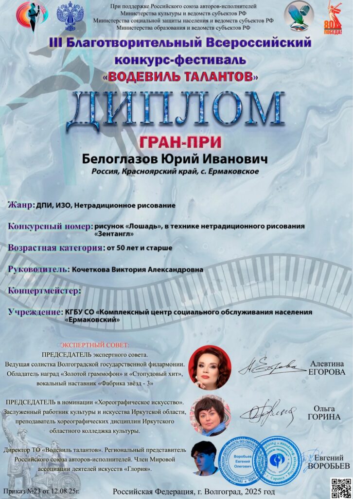 - Гран-при — Белоглазов Юрий Иванович с конкурсной работой «Лошадь» (рисунок в технике нетрадиционного рисования «Зентангл»).