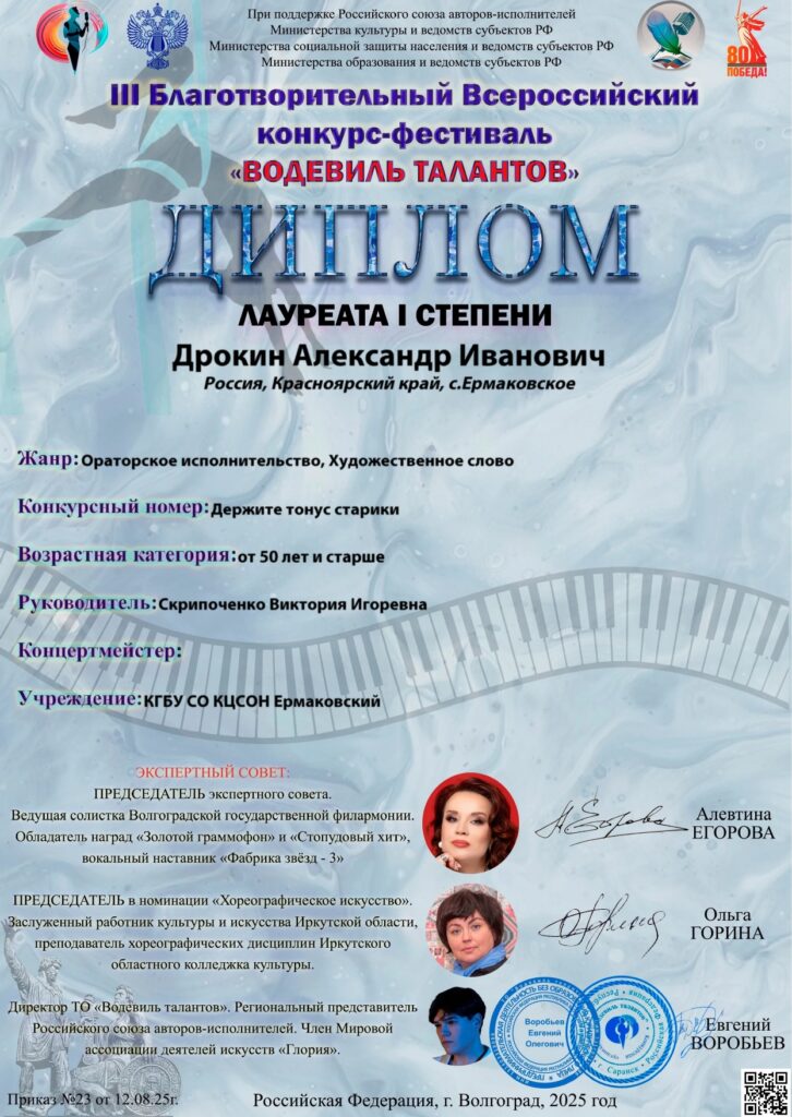 - Диплом лауреата I степени в той же номинации — Дрокин Александр Иванович, зачитавший авторские стихи “Держите тонус, старики”.