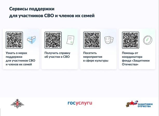 Чтобы воспользоваться сервисами поддержки для участников СВО и членов их семей, пожалуйста, отсканируйте QR-коды на информационной странице, содержащие ссылки на информационные ресурсы о мерах социальной поддержки.