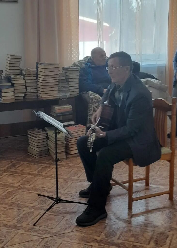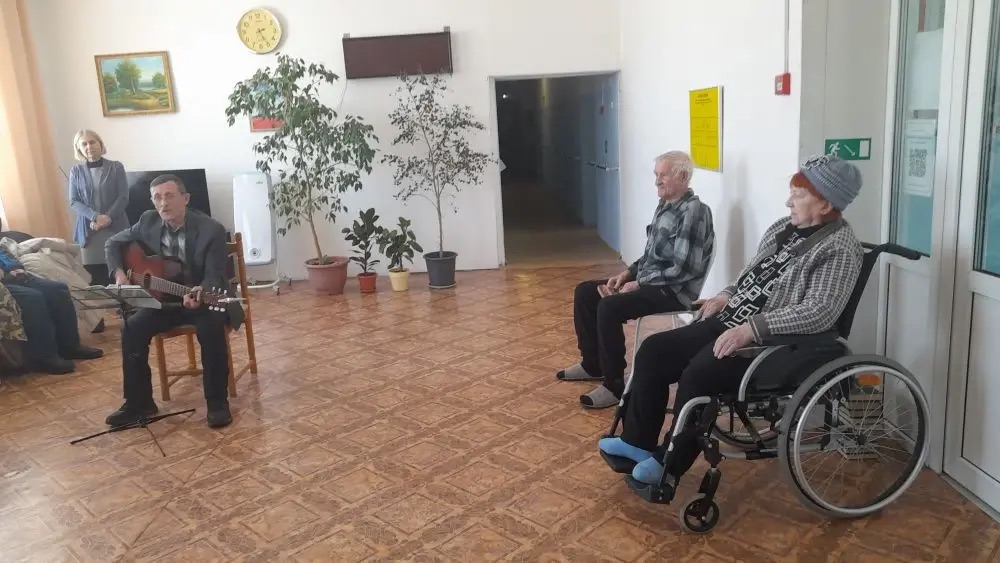 Чтобы продолжить создавать атмосферу тепла и внимания, столь необходимую людям, живущим в интернате, Анатолий Викторович Майнагашев выступил с мини-концертом авторских песен под гитару.